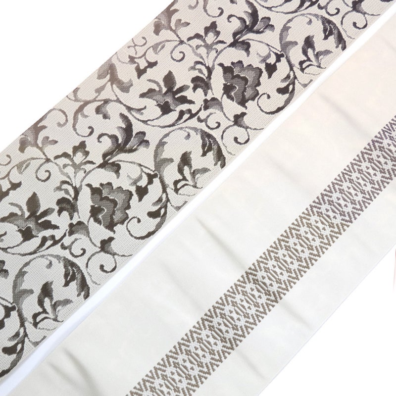しっかりした帯地で美しい織りの半幅帯は、上質な着物に締めても見劣りしない存在感と華やぎがあります。