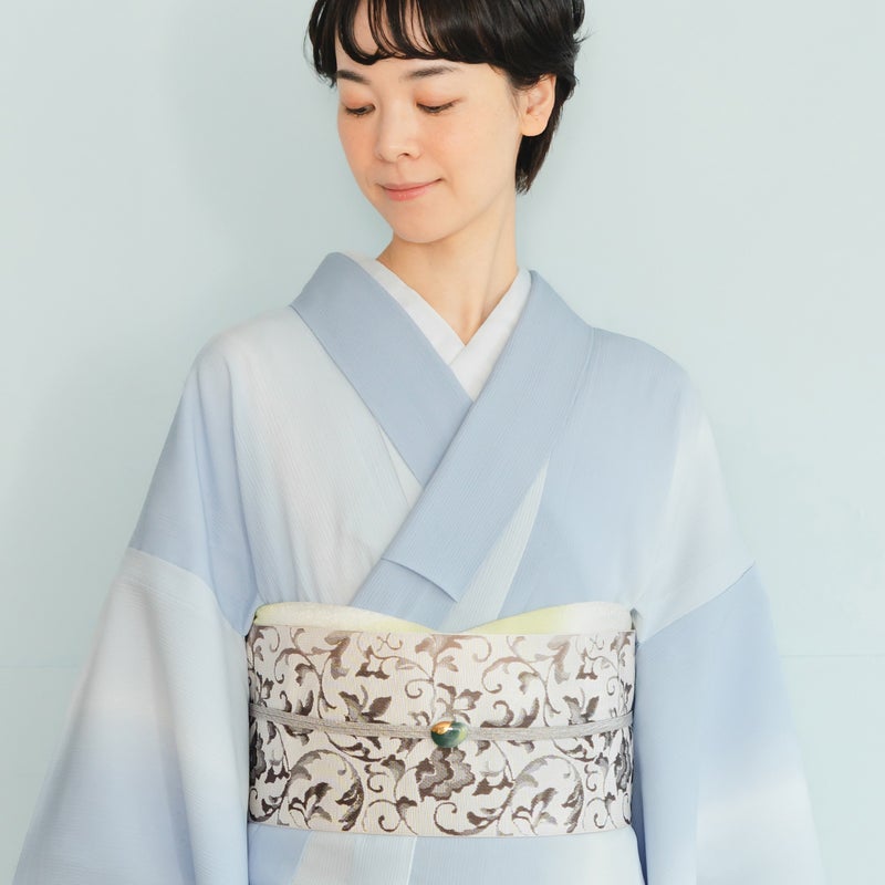 博多織の半幅帯は、一年中締めることができます。夏は麻楊柳着物や浴衣に合わせれば、ワンランク上のコーディネートに。柄ものもすっきりとまとめてくれるので、合わせる着物を選びません。