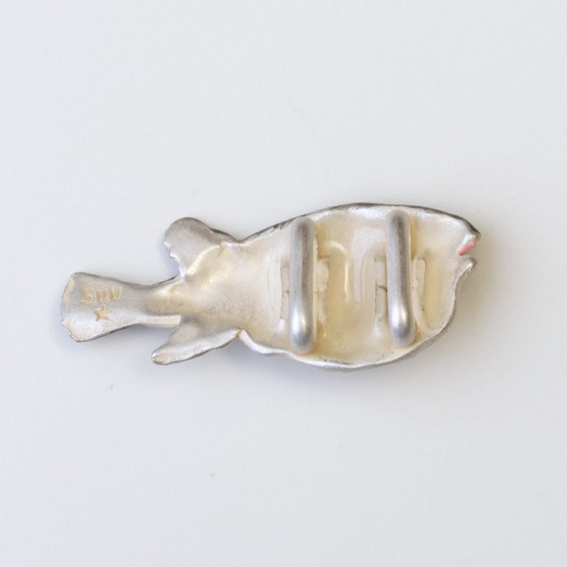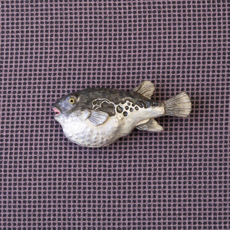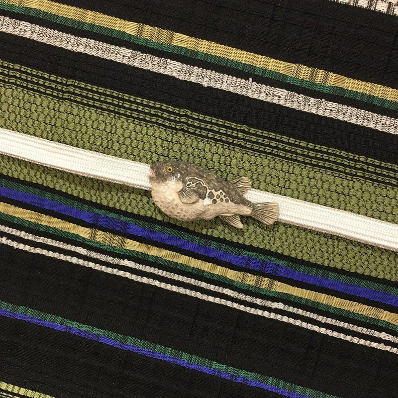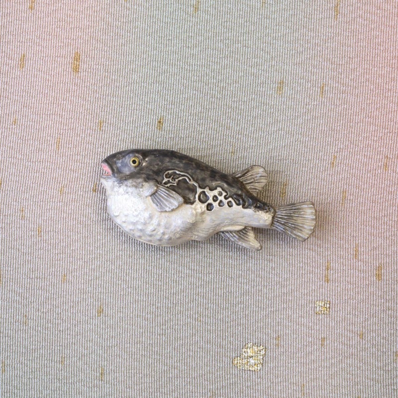 ふっくらとした姿が愛らしいフグの帯留めです。江戸時代に活躍した日本画家、伊藤若冲の「群魚図≪鯛≫」で描かれているフグがモデルになっています。
