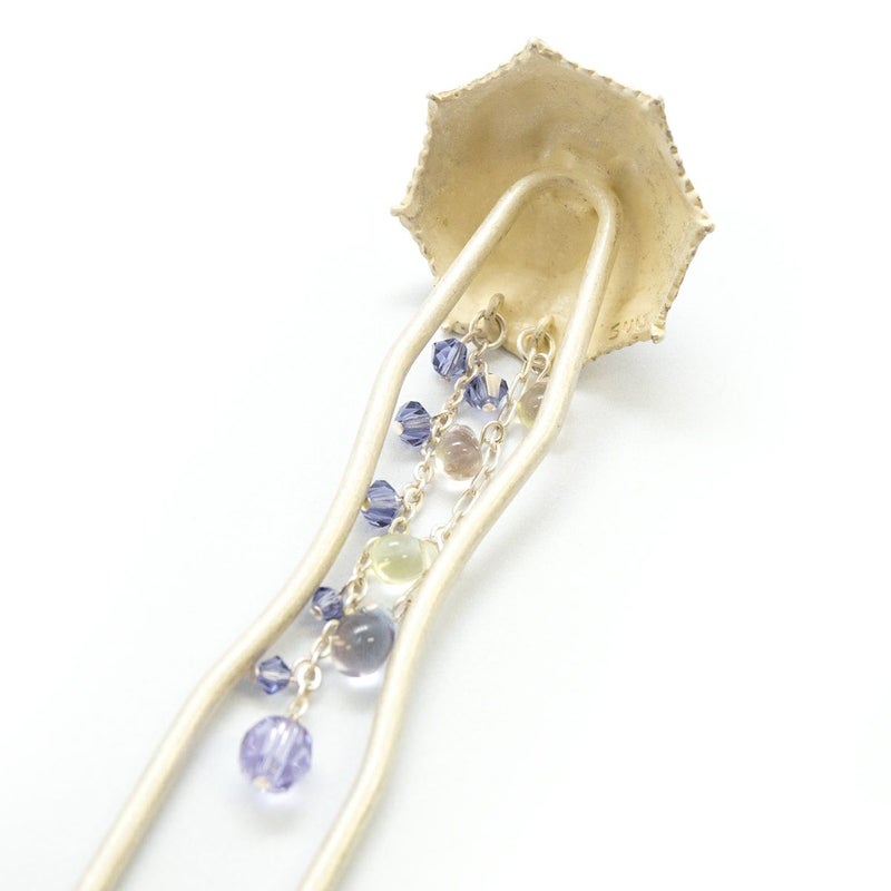 傘の下で揺れるビーズがきらめきながら、髪もとに爽やかな彩りを添えてくれます。やさしい華やぎを装いに。