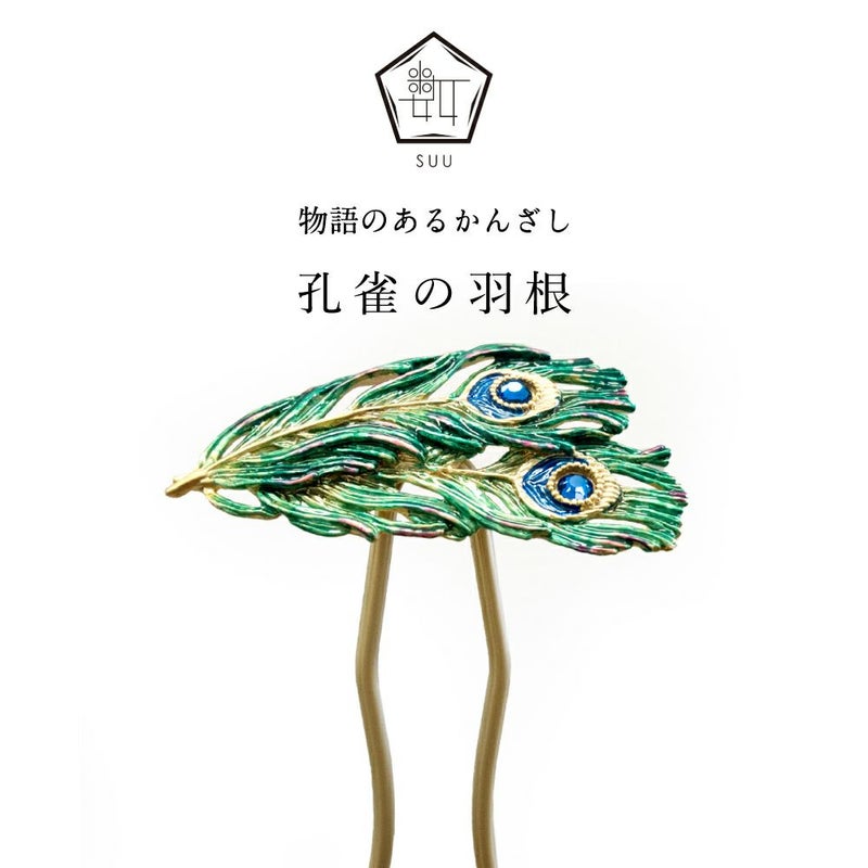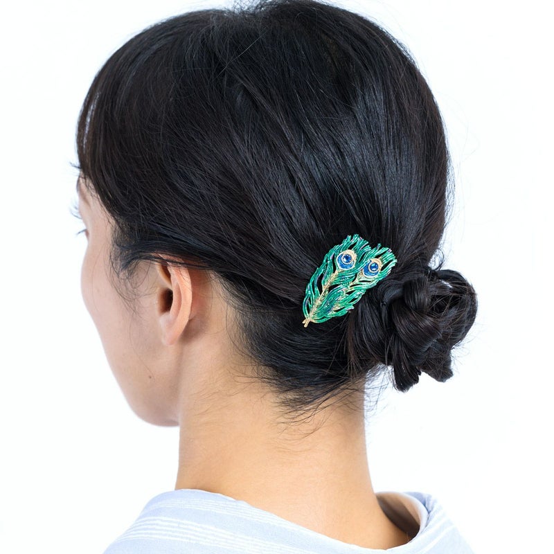 鮮やかな孔雀の羽根が幾重にも重なった、存在感あふれるかんざし。