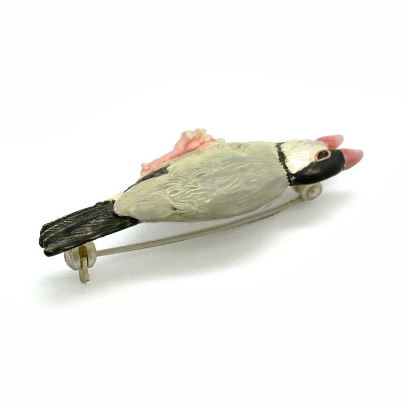 ちょっぴり怒った表情の文鳥のブローチ。