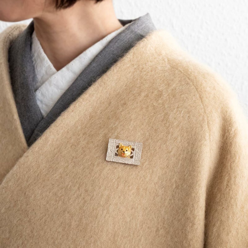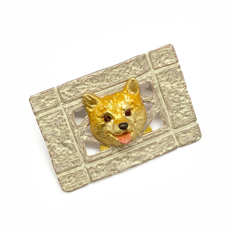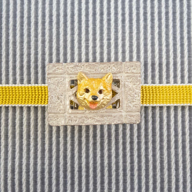 柴犬がブロック塀の隙間から、ひょっこり顔を覗かせるキュートなブローチ。