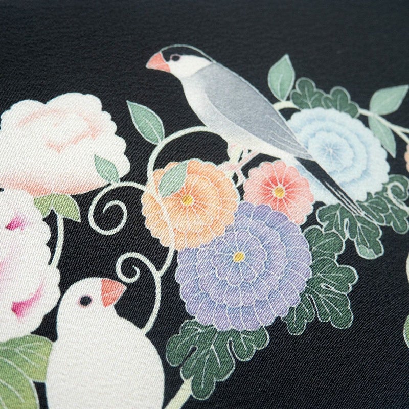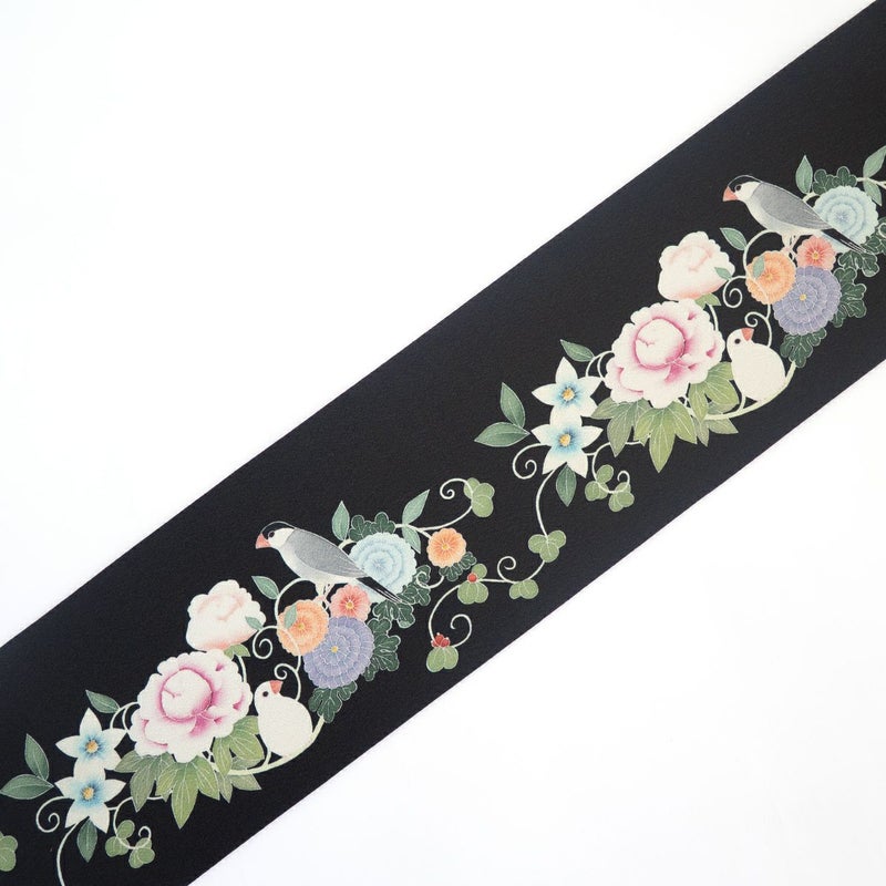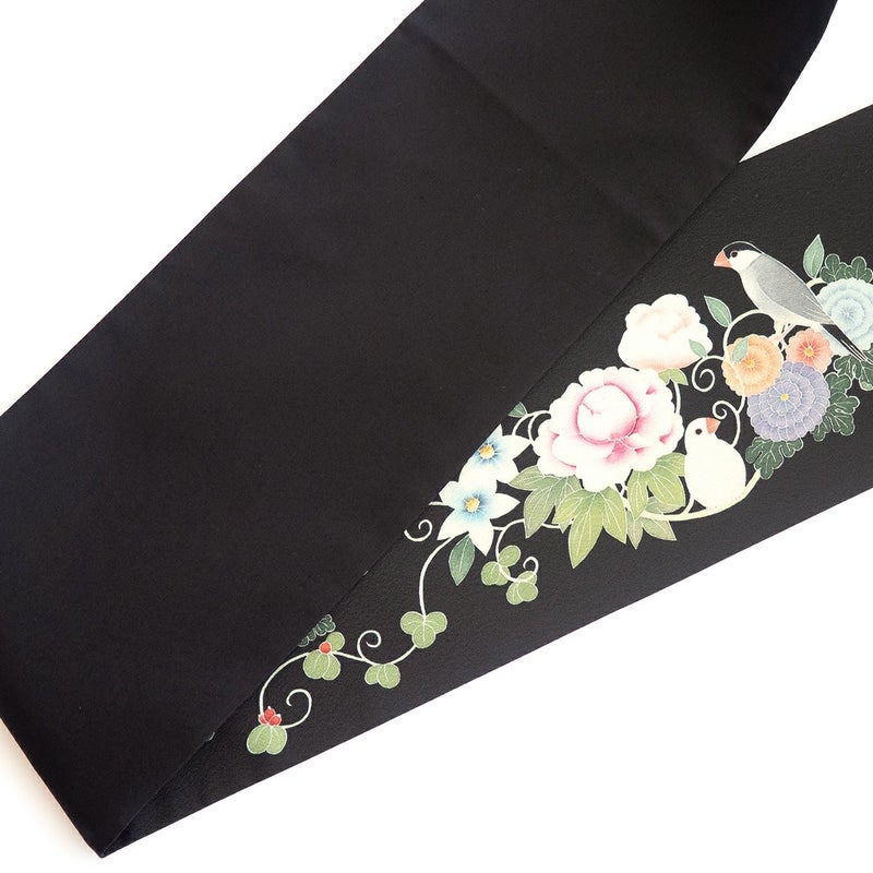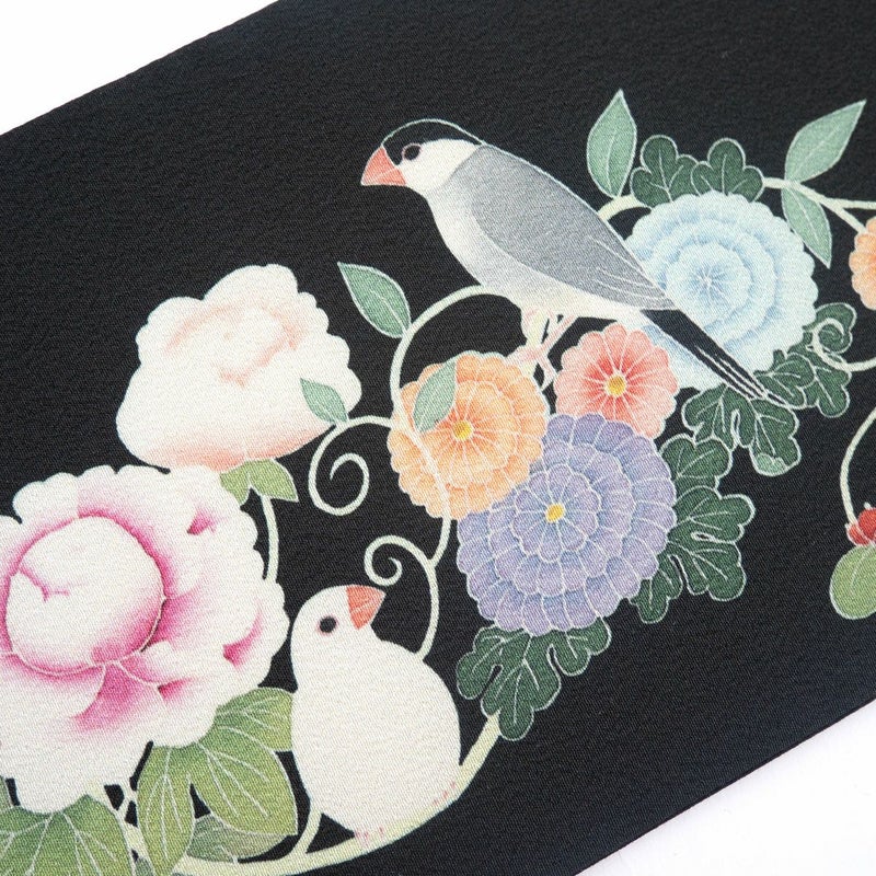 牡丹・菊・桔梗の美しい花々に、愛らしい文鳥が寄り添う半幅帯。 深みのある黒地が花々の色彩をいっそう引き立て、上品で華やかな印象を演出します。 季節を問わず、装いに彩りを添える一本です。