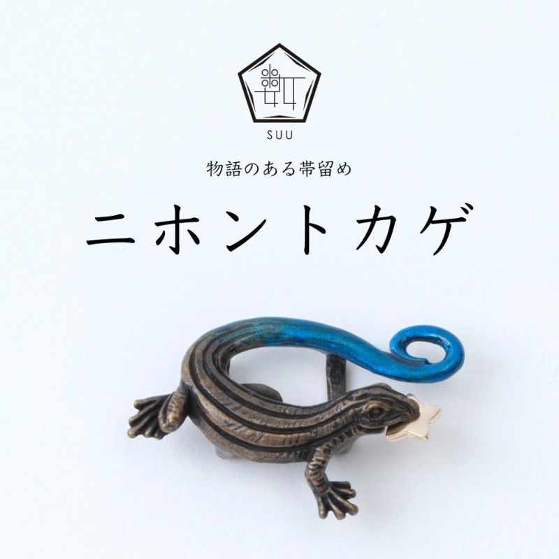 きれいな星を見つけ、口にくわえるニホントカゲくんの顔がどこか誇らしげな帯留めです。