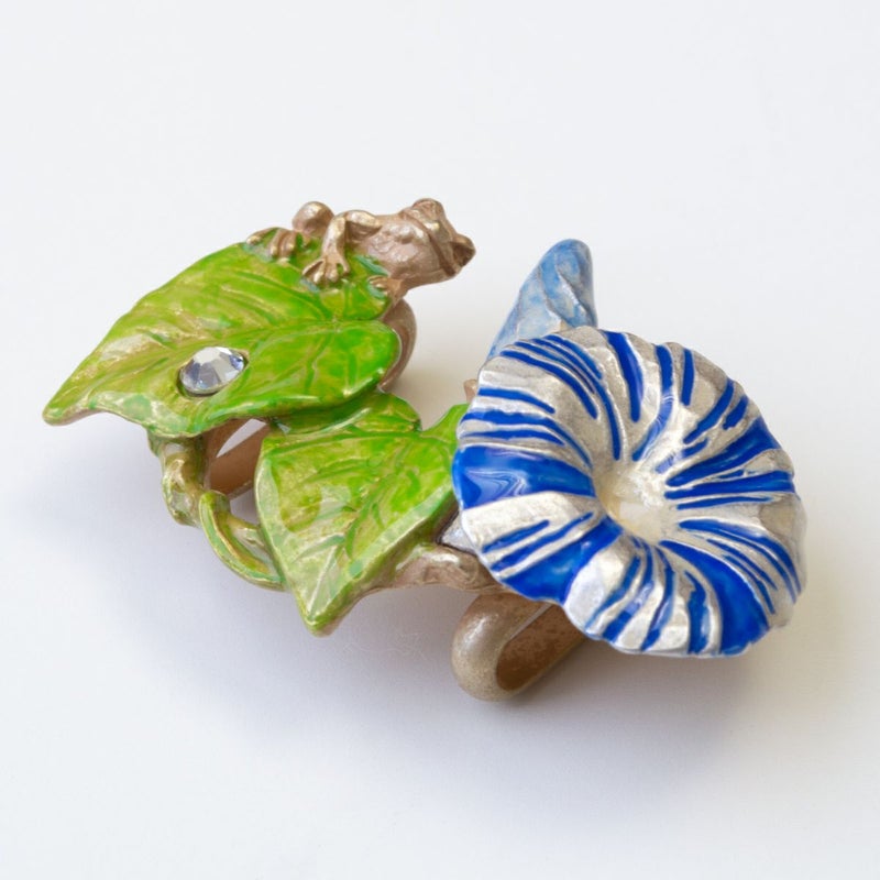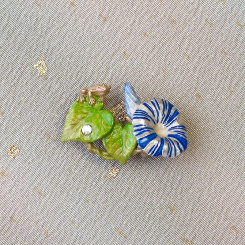 雨の翌日に朝日を浴びて花を咲かせた朝顔の帯留めです。葉っぱの上の雫がキラリと光っている様子もとても綺麗です♪