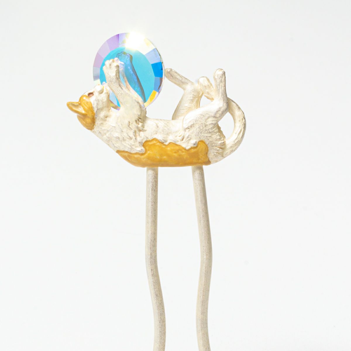 キラキラと光る大きなカットガラスにじゃれて遊ぶ猫のかんざしは、どちらの面も繊細に作りこまれ裏返しても違和感なく使うことが可能です。