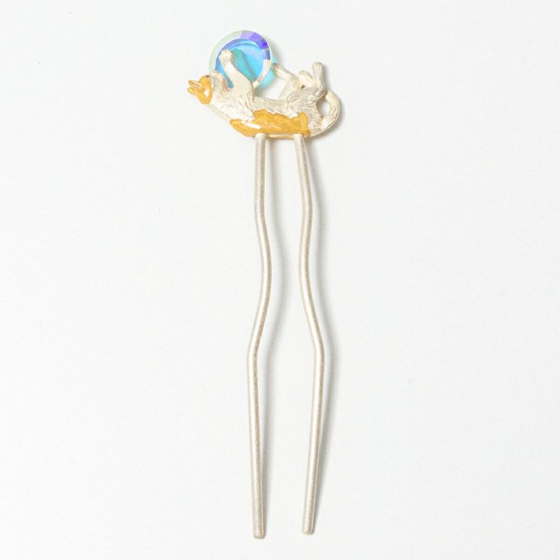 キラキラと光る大きなカットガラスにじゃれて遊ぶ猫のかんざしは、どちらの面も繊細に作りこまれ裏返しても違和感なく使うことが可能です。
