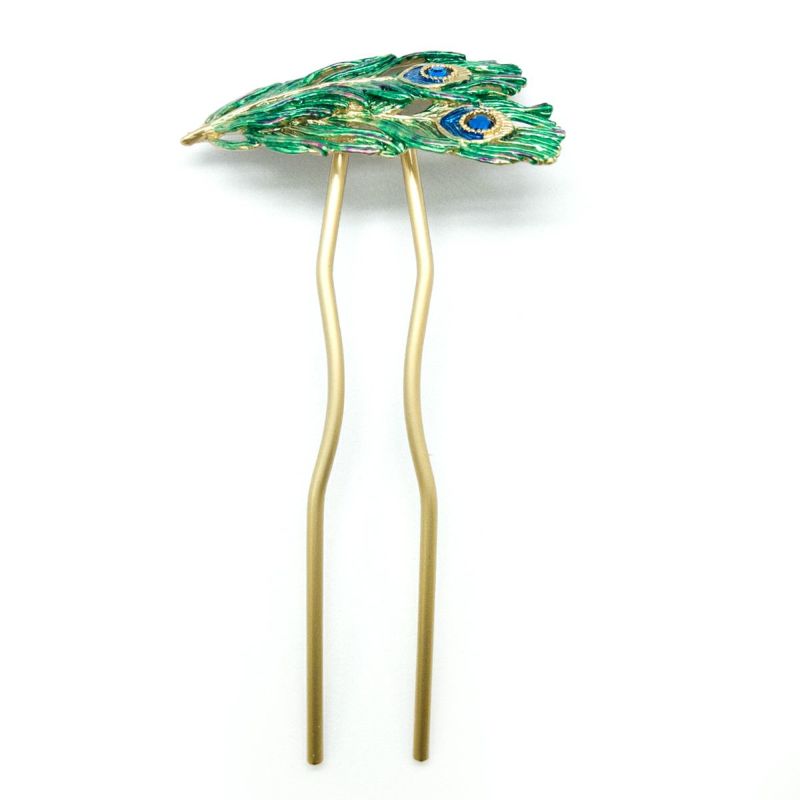 鮮やかな孔雀の羽根が幾重にも重なった、存在感あふれるかんざし。