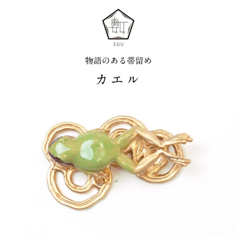 カエルと波紋の間に帯締めを通す立体的な造りとなっており、まるでカエルが浮いているかのよう♪