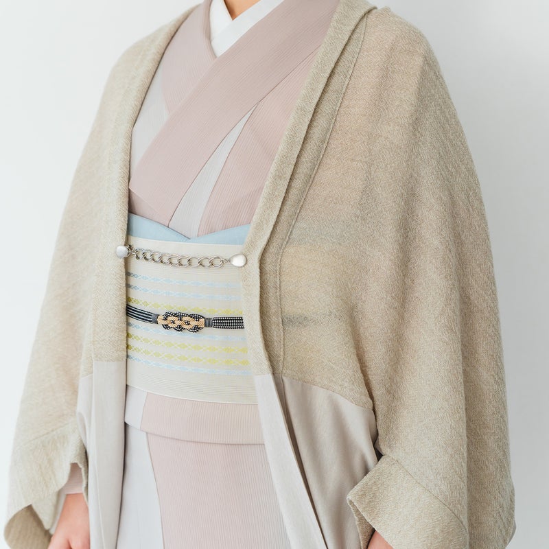 フロントホックで前を留めて着ることもできます。羽織紐やショールクリップを付けて、着こなしの変化も楽しめます。