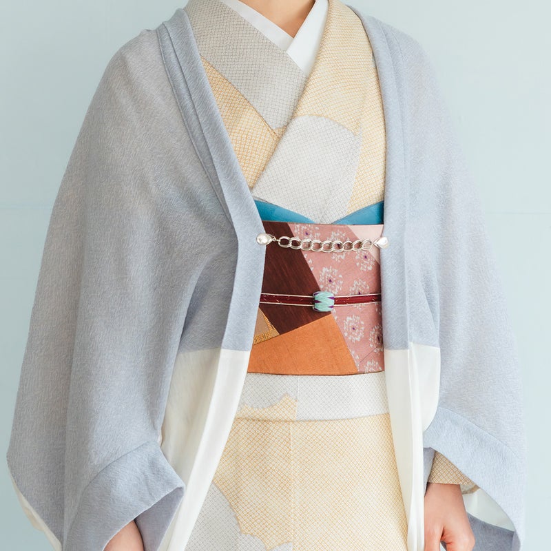 フロントホックで前を留めて着ることもできます。羽織紐やショールクリップを付けて、着こなしの変化も楽しめます。