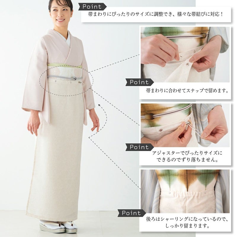 着用方法はとてもシンプル。サッと巻いてウエストのスナップを留め、アジャスターを絞ればぴったりサイズになります。