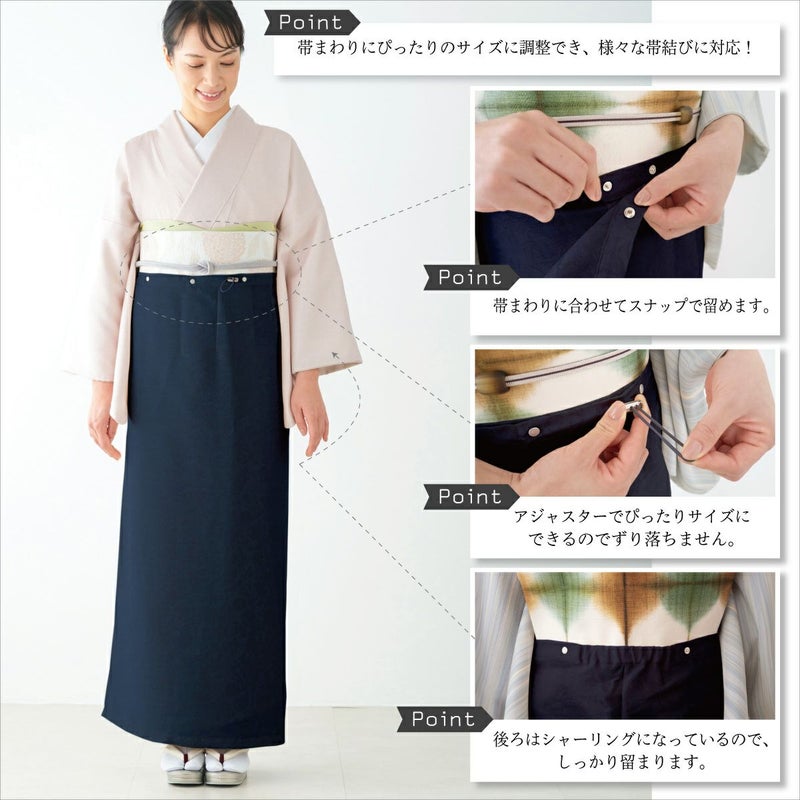 着用方法はとてもシンプル。サッと巻いてウエストのスナップを留め、アジャスターを絞ればぴったりサイズになります。
