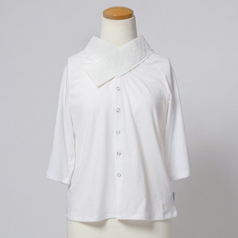 フロントにスナップボタンを付けた前開き仕様。ヘアセットやメイクをした後での着替えがしやすく、メイクで半衿が汚れる心配もありません。