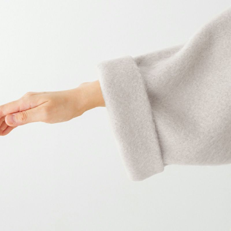 中に着る物を選ばないのがロングコートの良さ。長めの着丈でつくった【モヘアシャギーロングコート】なら、ボトムの丈を選ばずに合わせていただけます。