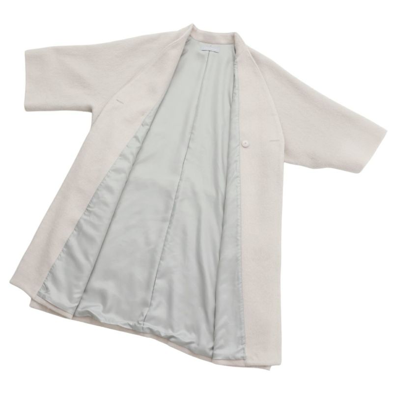 衿元は、着物の衿に沿う上品なVネック。丈の長いコートでもすっきりとした印象になり、首元のコーディネートも楽しめます。