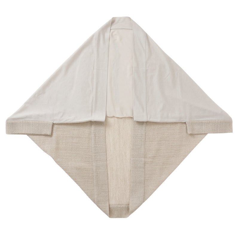 身幅がゆったりしていて、さっと羽織るだけで着物の袖や帯がすっぽり収まります。