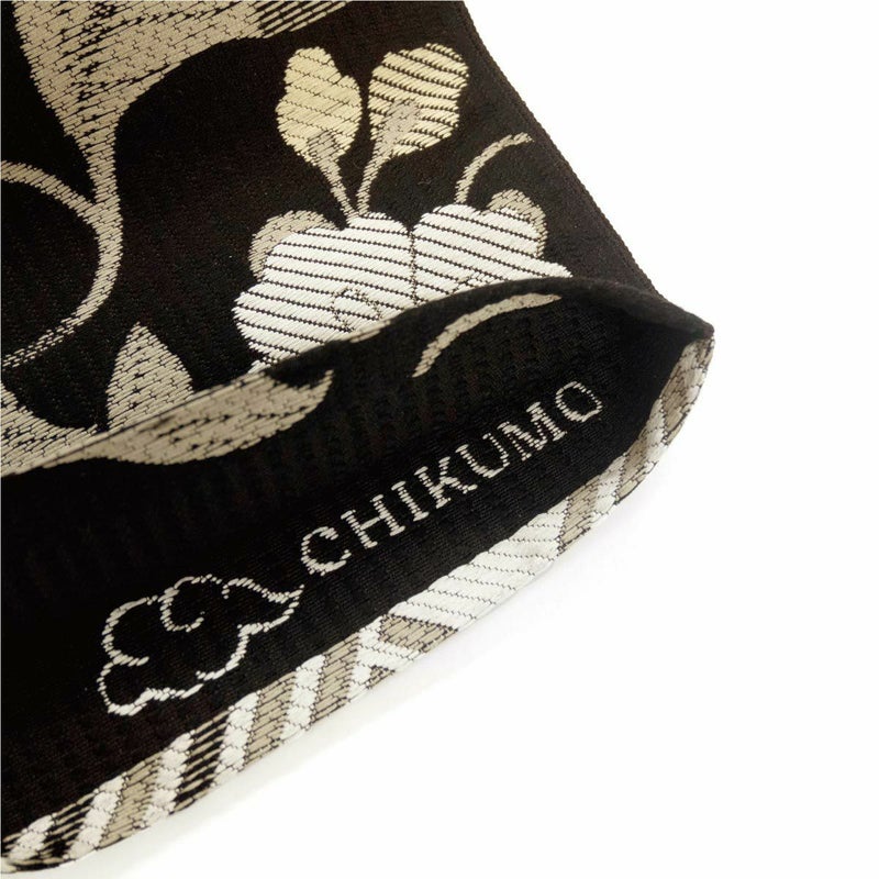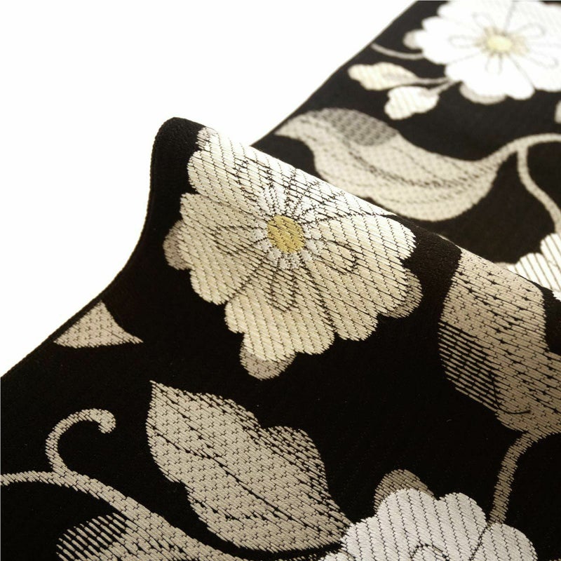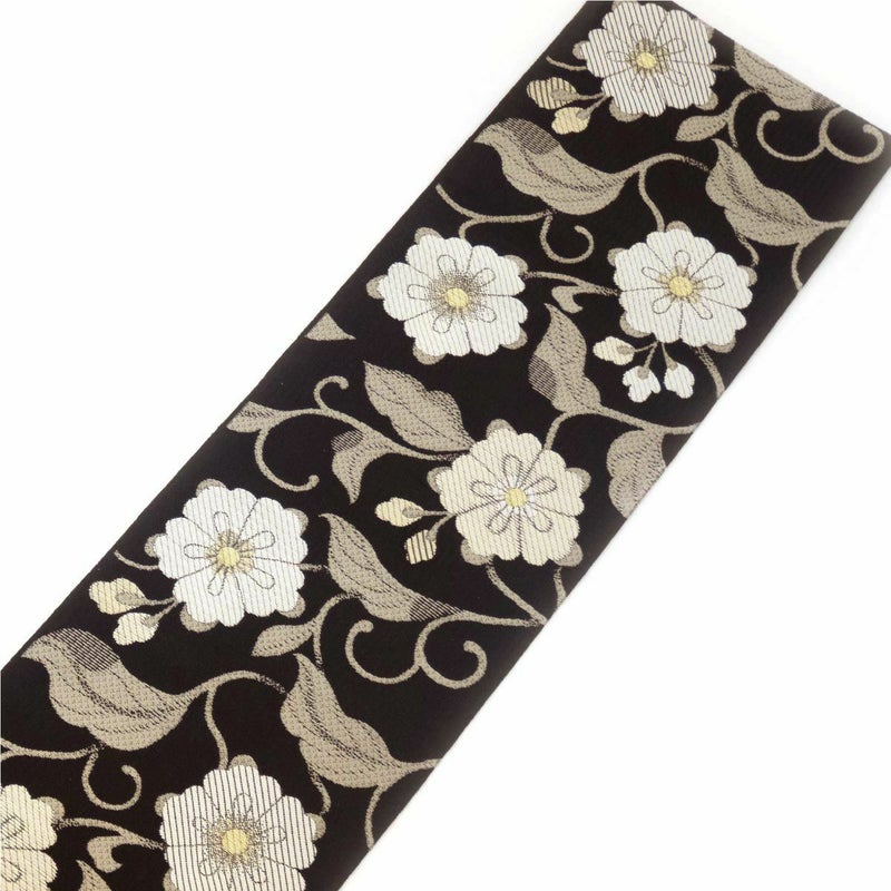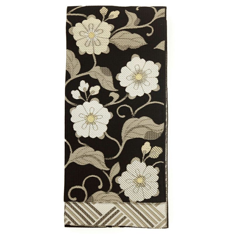 しっとりとした艶のある黒地に、伸びやかな花唐草紋様が織り出されています。 絹糸の美しい艶と、織りによる立体感と重厚感によって、上質な着物に合わせても気映えする存在感と華やぎがあります。 花柄でも可愛らしすぎないよう、シックなカラーで上品にまとめました。