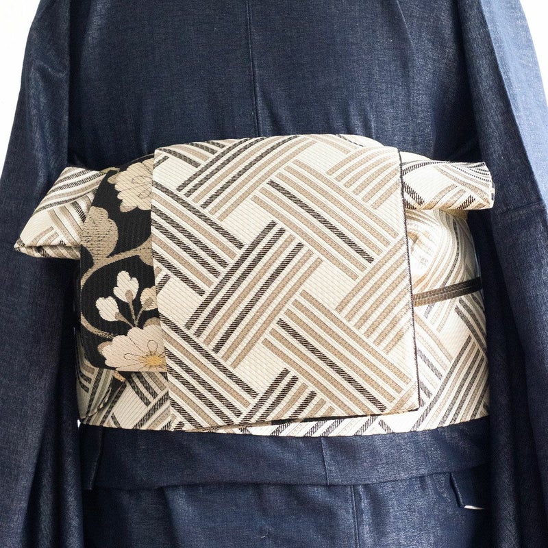 もう片方の面は、大きなあじろ柄。 直線が斜めに交差するシンプルな柄に、細やかな色のグラデーションで奥行きを表現しています。 優美な花唐草紋様と、粋ですっきりとしたあじろ柄。 両面で全く異なる印象を持ち、二本分の満足感のある半幅帯です。