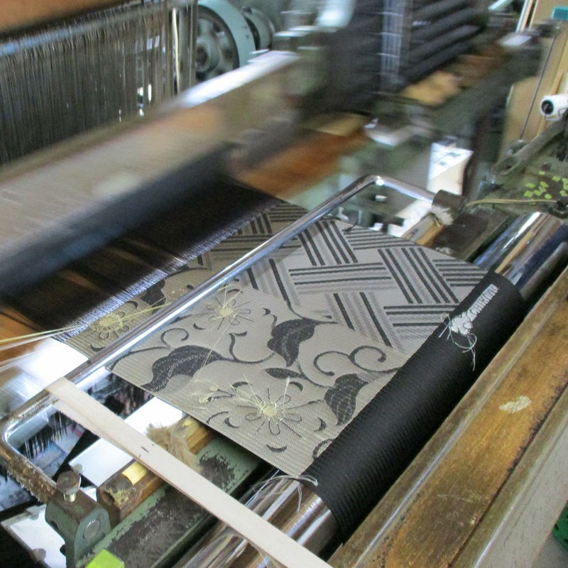 絵緯博多(えぬきはかた)と呼ばれる伝統的な技法で、織りの組織変化と糸色で柄を構成しています。 長年、オリジナル博多帯を制作いただいている織元は、博多帯としての高い品質と、織物を熟知したデザインや配色のセンスの高さで知られています。 今回の半幅帯にも、その技術と品質の高さ、感性が存分に活かされています。