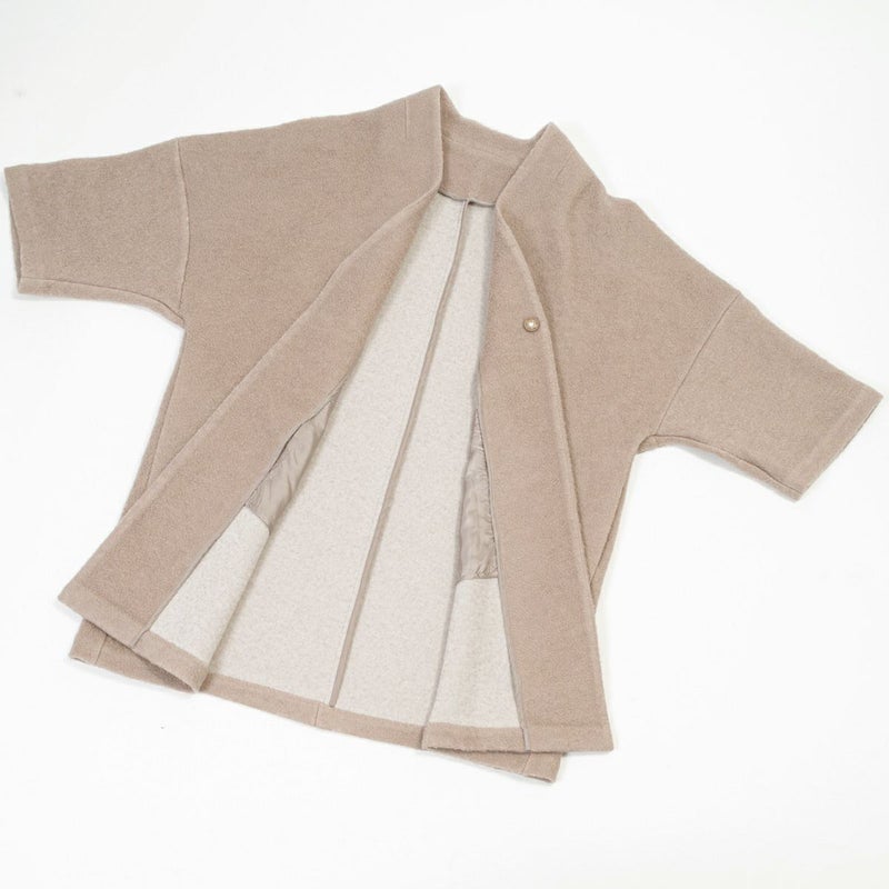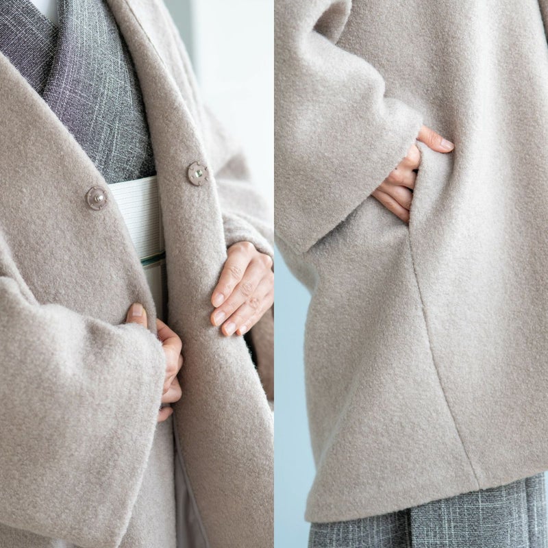 羽織や道行きコートとは全く異なるデザインで、着物に羽織るとモダンでお洒落な印象になります。