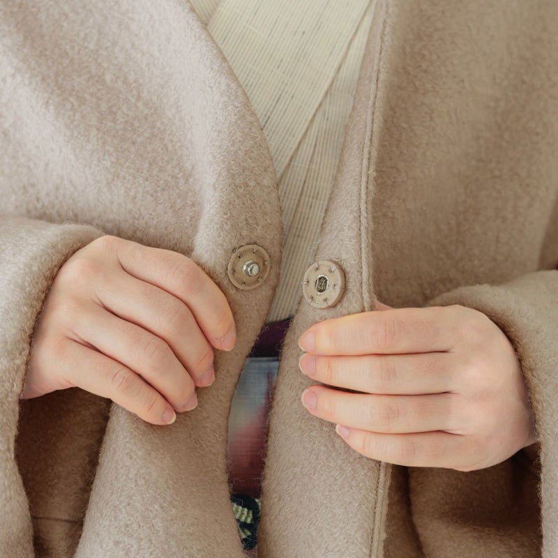 フロントはスナップボタン留めです。前を開けたり閉じたりして、雰囲気を変えられる素敵なデザイン。