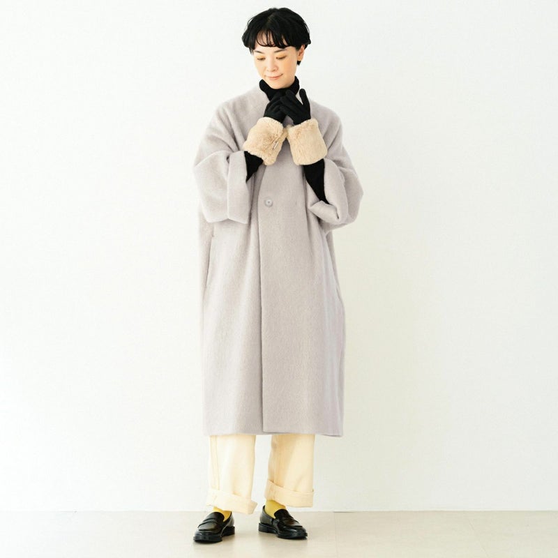 中に着る物を選ばないのがロングコートの良さ。長めの着丈でつくった【モヘアシャギーロングコート】なら、ボトムの丈を選ばずに合わせていただけます。