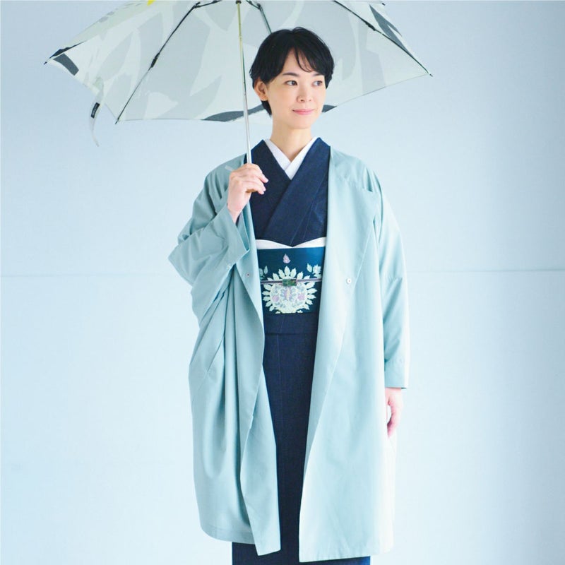レインコートは、ゆったりとした身頃と袖が、帯や着物の袖をしっかり包み込んでくれます。