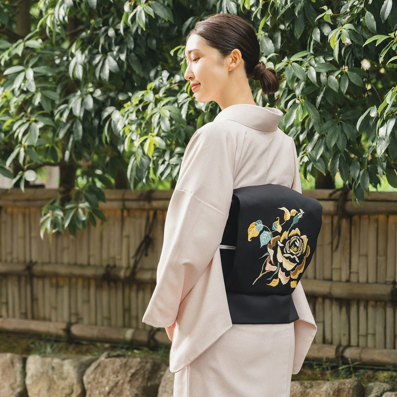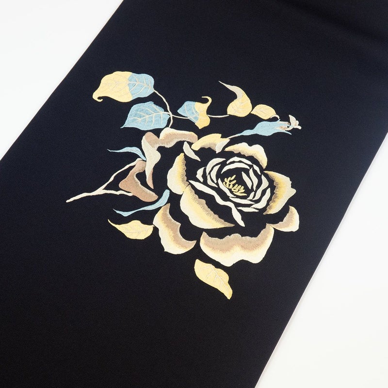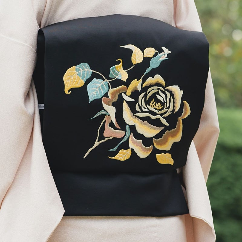 漆黒の地に浮かび上がる大輪の薔薇が目を引く【刺繍名古屋帯 アンティークローズ】