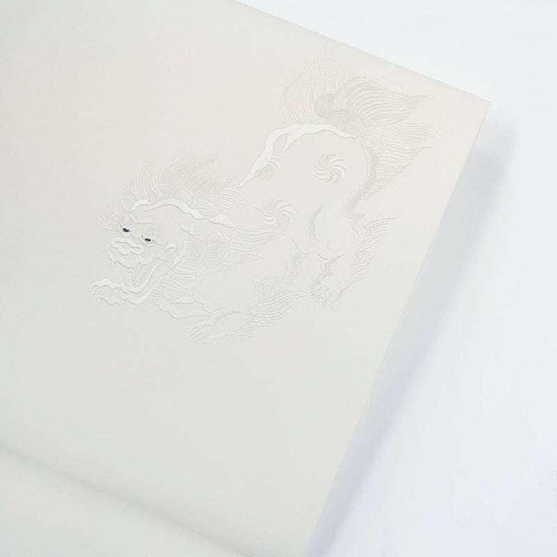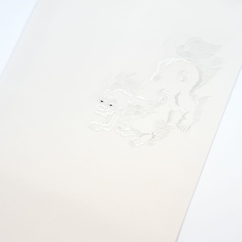お太鼓には、渦巻く巻き毛が力強く印象的な唐獅子を配置。目元にだけ金糸を用いることで、凛とした存在感を演出しています。