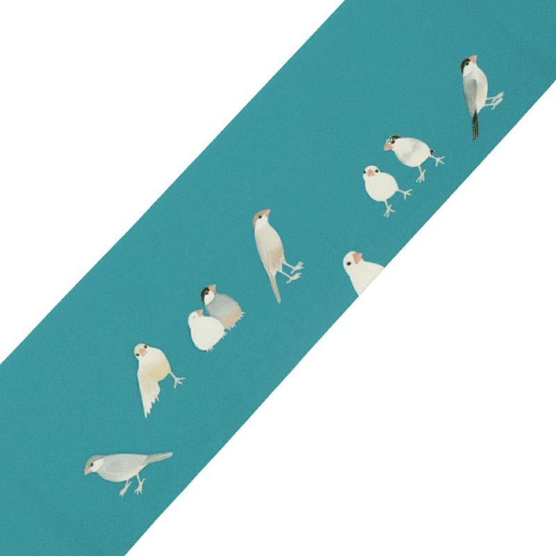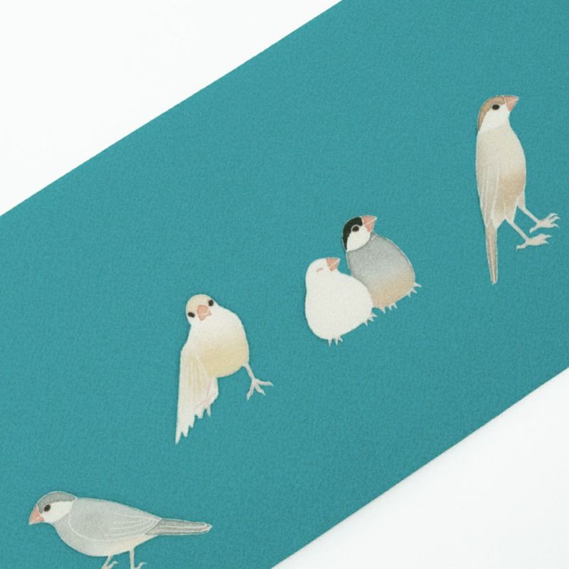 ・文鳥好きさん必見!様々な種類の可愛い文鳥たちのデザイン。 ・浴衣にも普段着物にもコーディネートしやすい半幅帯です。 ・絹によく似た手触りのシルジェリーを使用しました。