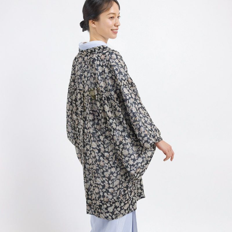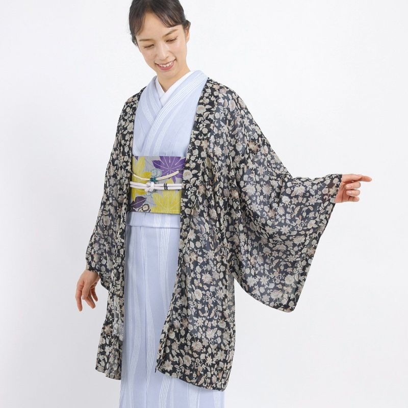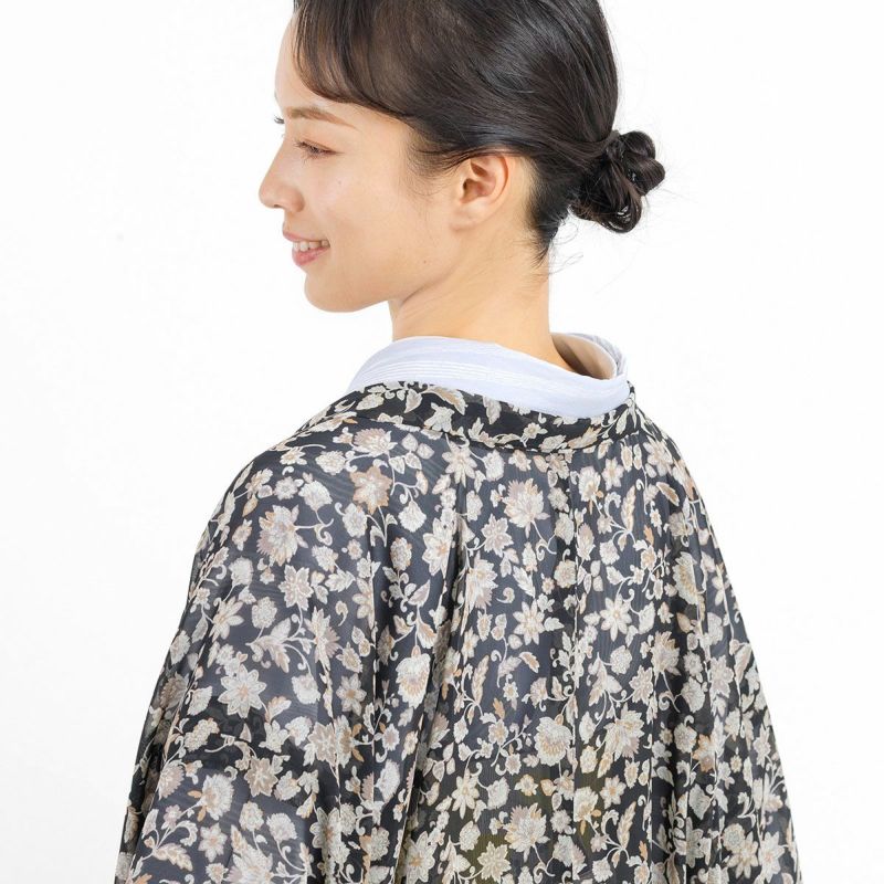 【洗える薄羽織 更紗 シフォン ブラック】は、つい着ているのを忘れてしまうくらいの超軽量。