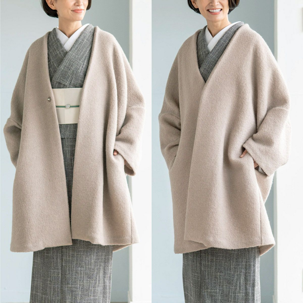 羽織や道行きコートとは全く異なるデザインで、着物に羽織るとモダンでお洒落な印象になります。