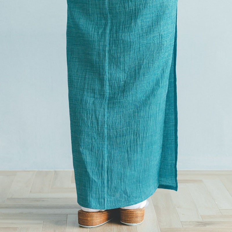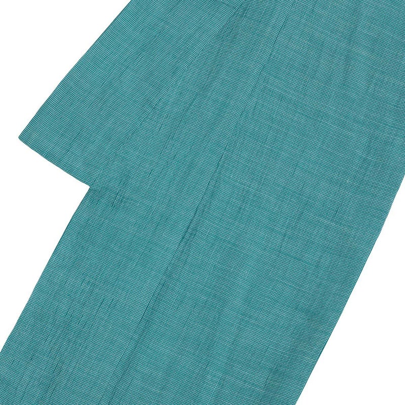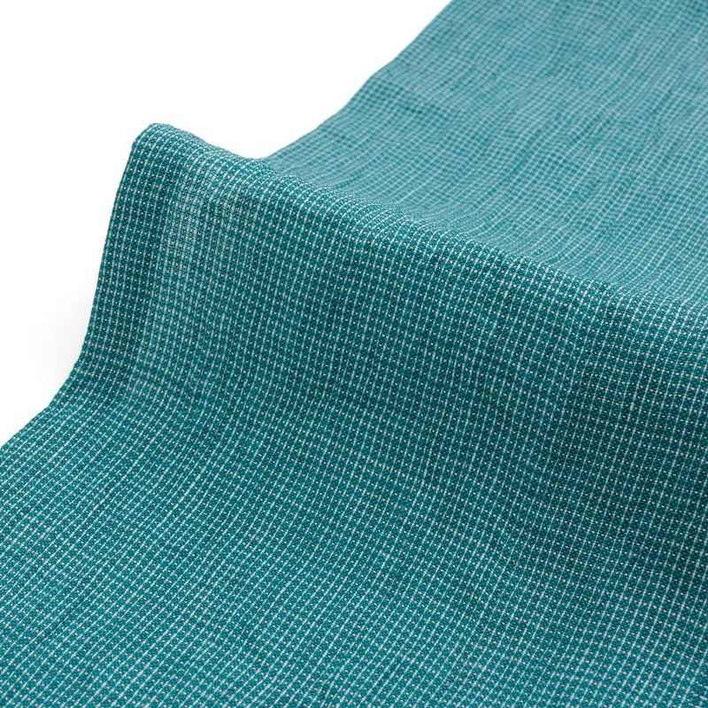 【はしご縞/孔雀】は、明るい陽射しに映える鮮やかな青緑に、白い糸でごく細かな格子柄を織り出しました。