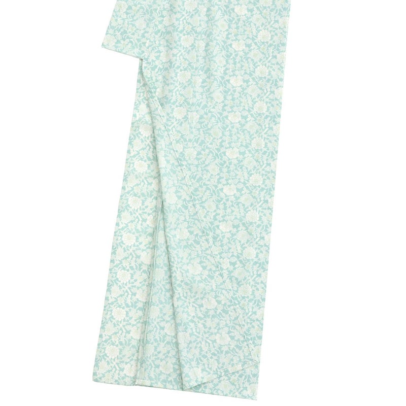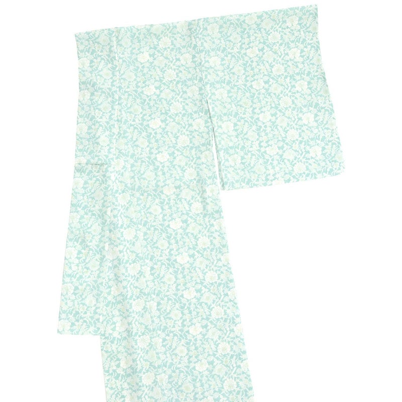 洗える夏きもの【セオα 牡丹唐草/青磁】は、小ぶりの牡丹唐草が型染め風の白揚げで染められた、総柄の小紋です。