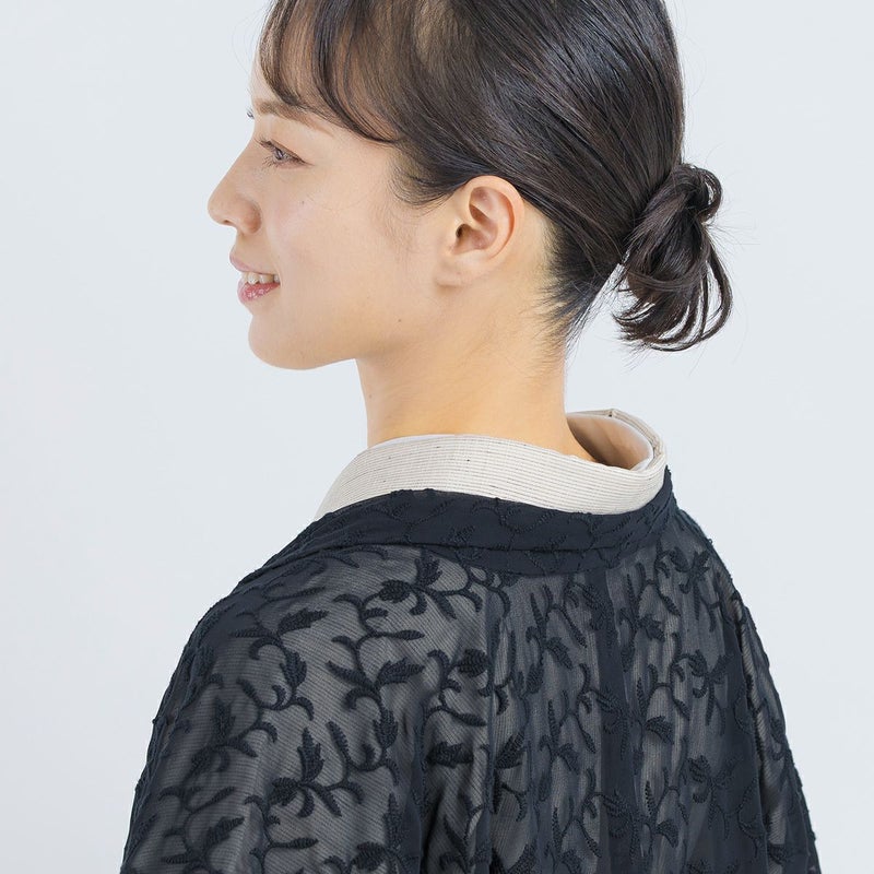 ボリューム感のあるコットンの刺繍糸を使い、立体的のある刺繍に仕上げています。コットンの素材感で、大げさにならず、気軽なお出掛けにも使いやすい羽織です。