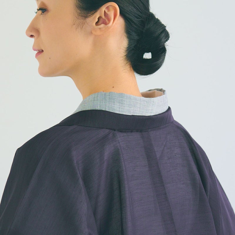 地に程よいハリ感を持ち、すっと流れるたおやかなラインが特徴です。羽織るだけで美しい着姿となるよう、細部のデザインにもこだわりました。