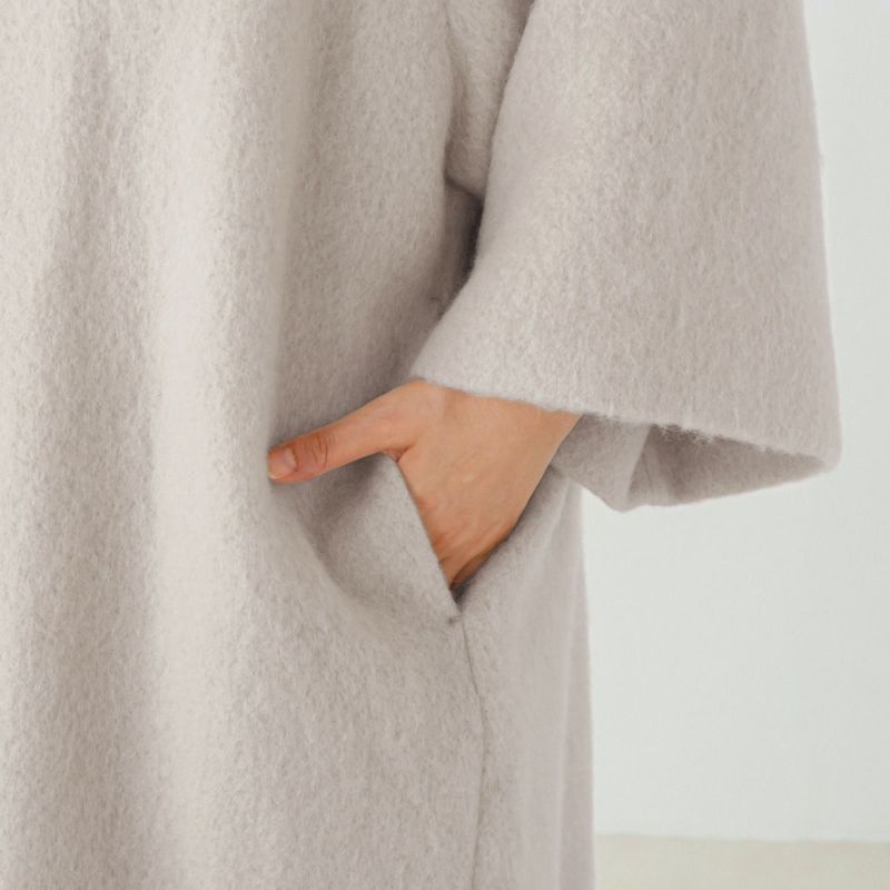 中に着る物を選ばないのがロングコートの良さ。長めの着丈でつくった【モヘアシャギーロングコート】なら、ボトムの丈を選ばずに合わせていただけます。