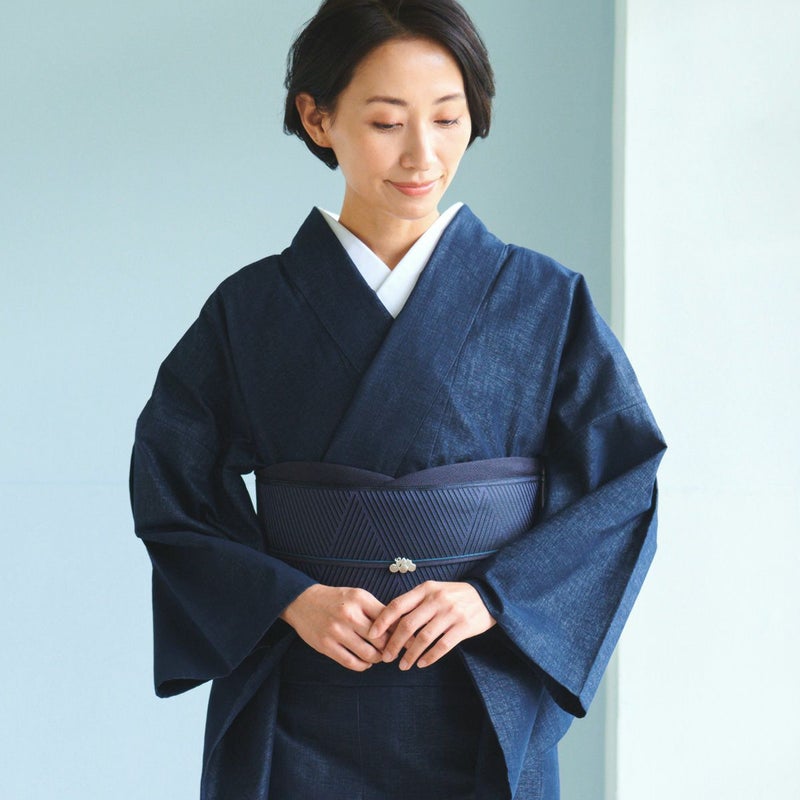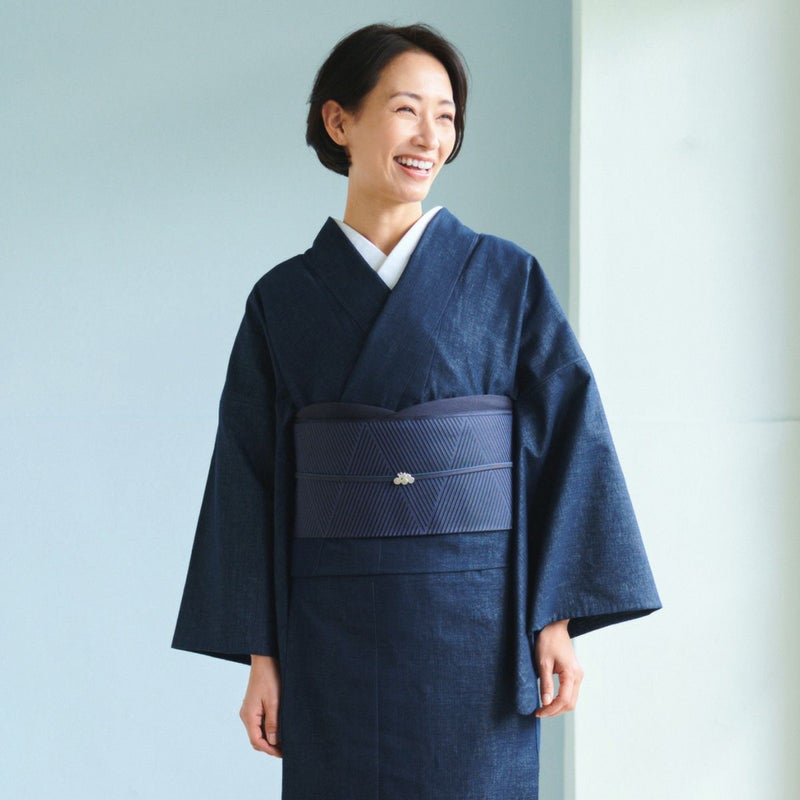 洋服のデニム同様に合わない色や柄がないので、帯やアウターのコーディネートが自由に楽しめるのもデニム着物の魅力。