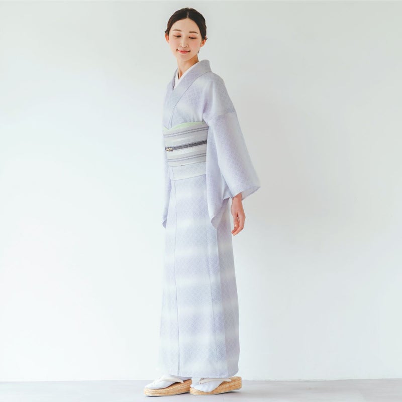 洗える夏きもの【鹿の子横段ぼかし/藤】は、淡い色の暈しが涼やかな、横段暈しの着物です。
