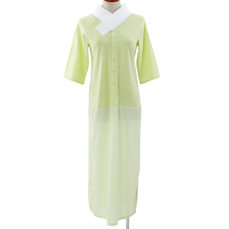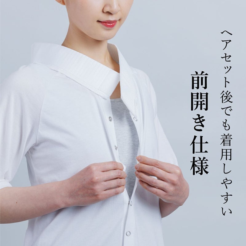フロントにスナップボタンを付けた前開き仕様。ヘアセットやメイクをした後での着替えがしやすく、メイクで半衿が汚れる心配もありません。