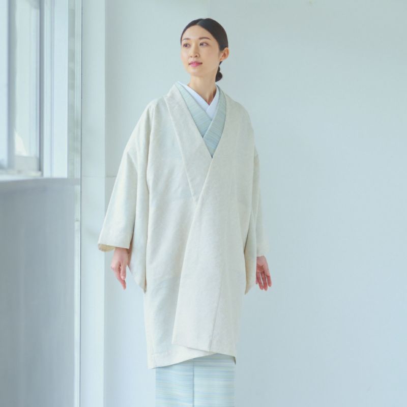単衣仕立てで軽く、暑い時期にも雨除けとして着やすく、冬場は羽織ものの上に重ねて着ることができます。