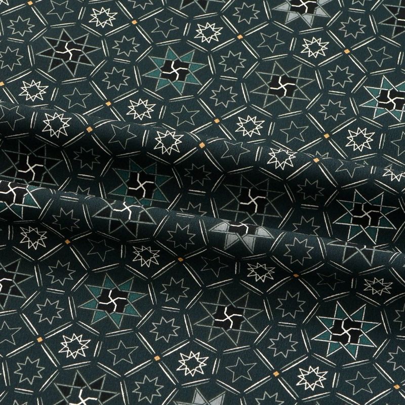 黒に近い深い緑色に、幾何学柄がモダンな小紋。
