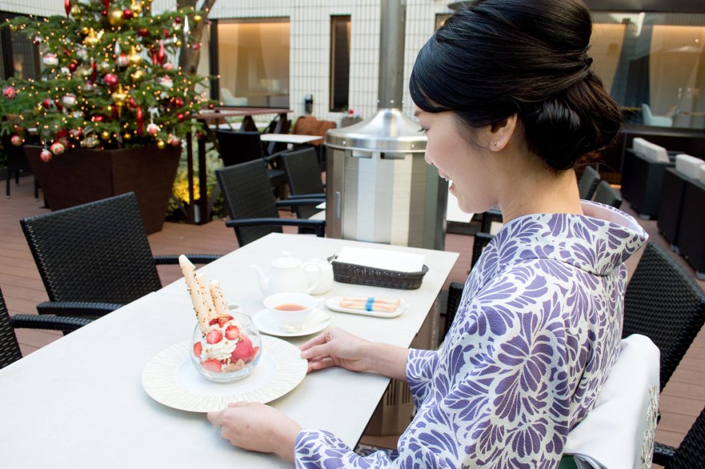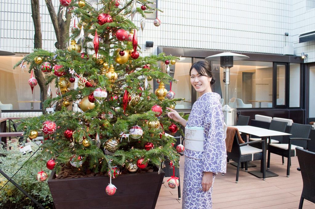 テラス席には大きなクリスマスツリーが飾られています。冬の寒さも青空の下だと気持ちが良いものですね。
