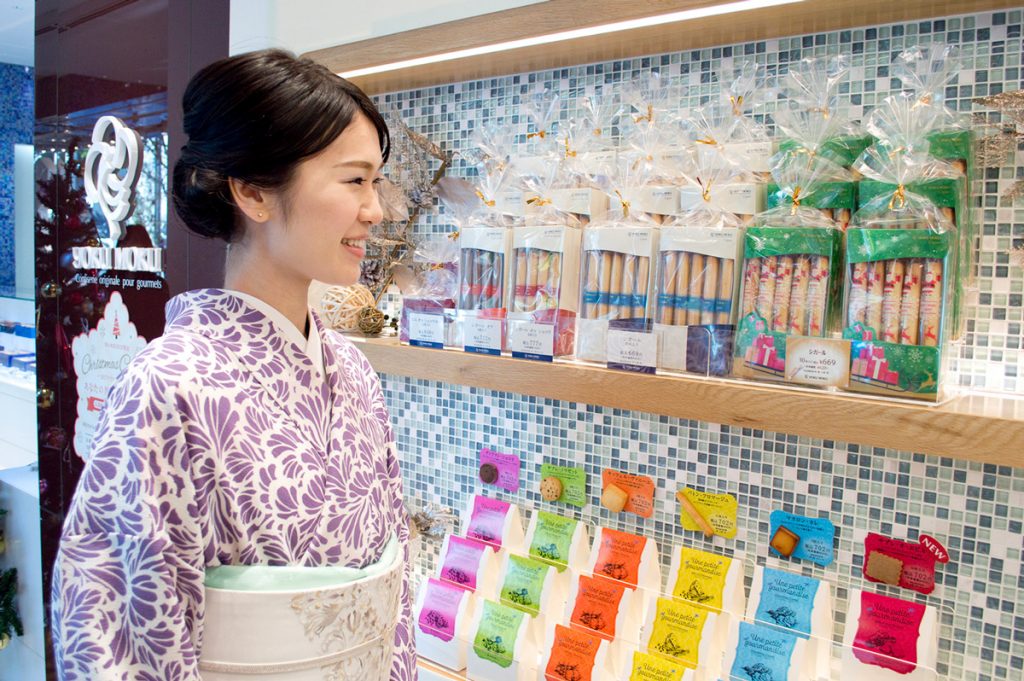 葉巻状のクッキー“シガール”で有名な洋菓子ブランド《ヨックモック》。ブルータイルが印象的な青山本店を訪れました。