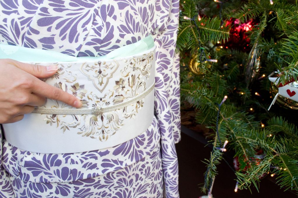 白地の帯にたっぷり刺繍、帯留めの「雪輪」も加わって、まさにホワイトクリスマス。