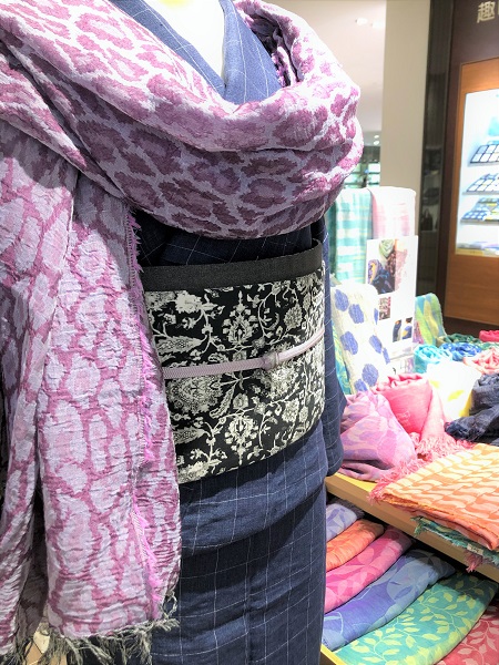 どことなくオリエンタルな柄行の半幅帯は、モノトーンの配色が洗練された雰囲気。リバーシブルにもなる裏面はデニムになっています。